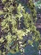 Lichens come in many colors.[7]:4 Coloration is usually determined by the photosynthetic component.[25] Special pigments, such as yellow usnic acid, give lichens a variety of colors, including reds, oranges, yellows, and browns, especially in exposed, dry habitats.[31] In the absence of special pigments, lichens are usually bright green to olive gray when wet, gray or grayish-green to brown when dry.[31] This is because moisture causes the surface skin (cortex) to become more transparent, exposing the green photobiont layer.[31] Different colored lichens covering large areas of exposed rock surfaces, or lichens covering or hanging from bark can be a spectacular display when the patches of diverse colors "come to life" or "glow" in brilliant displays following rain.
