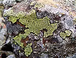 Lichens may be long-lived, with some considered to be among the oldest living organisms.[4][16] Lifespan is difficult to measure because what defines the "same" individual lichen is not precise.[56] Lichens grow by vegetatively breaking off a piece, which may or may not be defined as the "same" lichen, and two lichens can merge, then becoming the "same" lichen.[56] An Arctic species called "map lichen" (Rhizocarpon geographicum) has been dated at 8,600 years, apparently the world's oldest living organism.[57]