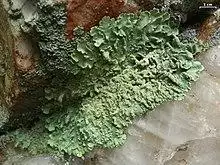 A lichen (/ˈlaɪkən/ LY-ken or, sometimes in the UK, /ˈlɪtʃən/, LICH-en) is a composite organism that arises from algae or cyanobacteria living among filaments of multiple fungi species[1] in a mutualistic relationship.[2][3][4] Lichens have properties different from those of their component organisms. Lichens come in many colors, sizes, and forms and are sometimes plant-like, but lichens are not plants. Lichens may have tiny, leafless branches (fruticose), flat leaf-like structures (foliose), flakes that lie on the surface like peeling paint (crustose),[5] a powder-like appearance (leprose), or other growth forms.[6]