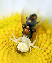 | A white crab spider has captured a fly visiting a flower, showing a mix of mutualism and predation. | |||