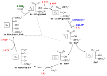 2 that is captured by enediol in second step produces an unstable six-carbon compound called 2-carboxy 3-keto 1,5-biphosphoribotol (CKABP[6]) (or 3-keto-2-carboxyarabinitol 1,5-bisphosphate) that immediately splits into 2 molecules of 3-phosphoglycerate (also written as 3-phosphoglyceric acid, PGA, 3PGA, or 3-PGA), a 3-carbon compound.[7] - The enzyme phosphoglycerate kinase catalyses the phosphorylation of 3-PGA by ATP (which was produced in the light-dependent stage). 1,3-Bisphosphoglycerate (1,3BPGA, glycerate-1,3-bisphosphate) and ADP are the products. (However, note that two 3-PGAs are produced for every CO