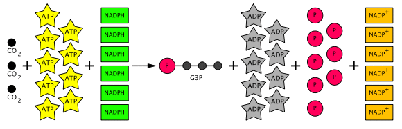 2 + 6 NADPH + 6 H+ + 9 ATP → glyceraldehyde-3-phosphate (G3P) + 6 NADP+ + 9 ADP + 3 H