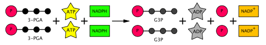 2 fixed.) - The enzyme glyceraldehyde 3-phosphate dehydrogenase catalyses the reduction of 1,3BPGA by NADPH (which is another product of the light-dependent stage). Glyceraldehyde 3-phosphate (also called G3P, GP, TP, PGAL, GAP) is produced, and the NADPH itself is oxidized and becomes NADP+. Again, two NADPH are utilized per CO
