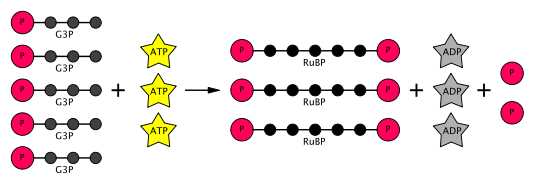The next stage in the Calvin cycle is to regenerate RuBP. Five G3P molecules produce three RuBP molecules, using up three molecules of ATP. Since each CO
