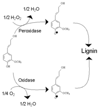 The polymerisation step, that is a radical-radical coupling, is catalysed by oxidative enzymes. Both peroxidase and laccase enzymes are present in the plant cell walls, and it is not known whether one or both of these groups participates in the polymerisation. Low molecular weight oxidants might also be involved. The oxidative enzyme catalyses the formation of monolignol radicals. These radicals are often said to undergo uncatalyzed coupling to form the lignin polymer.[24] An alternative theory invokes an unspecified biological control.[1]