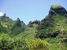 Limahuli lies within a tropical valley covering three distinct ecological zones. It is inland from the Haʻena State Park and Keʻe beach off of Route 560 (near its western end) at 22°13′13″N 159°34′33″W / 22.22028°N 159.57583°W. The Makana Mountain ridge looms behind, and the Limahuli Stream includes an 800-foot (240 m) waterfall[1] on its descent from the valley's high end at 3,330 feet (1,010 m) to sea level just below the garden.[2] This area is sometimes known as Bali Ha'i, a name used in the 1958 film South Pacific which was filmed on location in the area.[3] The name comes from lima huli which means "turned hand" in the Hawaiian language.[4]