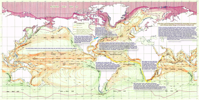 The scenario advanced by Heartland and Great Lakes setting advocates considers that events at Jerusalem and teetering family relations, had made it unwise for Lehi's family to flee to the populated Mediterranean coast. The prospect of sailing to another land of promise by way of the Mediterranean was therefore out of the question. In an effort to avoid adversaries, Lehi's family fled into the southern desert, eventually arriving at an isolated location on the southeastern shore of the Arabian Peninsula. There they constructed a ship. Currents and seasonal winds at this location could have carried them to the coast of Africa and southward.[101] There may have been more than thirty individuals in Lehi's company at this point. They would have had only so much stowage aboard their vessel for food and fresh water. The preferred route to the land of promise would have been one that would stay within easy reach of a coastline (food and much needed fresh water) most of the voyage. After "many days" at sea, they confronted a fearsome tempest (proposed to have occurred near Africa's horn). Thereafter, with enough fresh water and supplies stored on board, they crossed over to the Western Hemisphere along the shorter and more direct route between the Old World and the New World – assisted by the prevailing winds and equatorial currents of the Atlantic. Still aided by currents and winds, they sailed along American coasts and island chains until they arrived near the Gulf of Mexico. At this point the opinions of Olive and May diverge as to the final landing of Lehi.