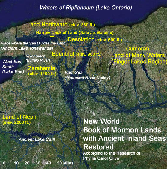 - In opposition to placing the setting for the Book of Mormon in lands near the Great Lakes (lands now occupied by the United States of America, 1 Nephi 13:30, 2 Nephi 10:10-11, Doctrine and Covenants 10:48-51) it has been suggested that a feature as significant as Niagara Falls could not escape mention in the Book of Mormon had this been the area in which the civilizations described in it existed (Palmer 1990). However, in the limited Great Lakes setting proposed by Olive, Niagara Falls situate on a watery western extremity and would not have been encountered in any of the situations detailed in the abridged Nephite narrative. The fact that western New York was inundated in antiquity fits the description found in Ether 13:2. Olive points out that there were several cataracts along the northern escarpment, resulting from the overflow of old Lake Tonawanda (believed to be the Book of Mormon's land-dividing sea, Ether 10:20). More than one of these may have rivaled the falls of Niagara (Olive 2008). The land northward in Olive's Book of Mormon settings certainly qualifies as a land of "many water, rivers and fountains" (Mormon 6:4). It may well be asked why Niagara Falls should have received so much attention.[84]