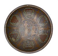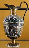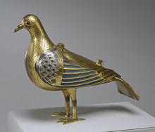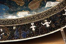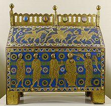 In the 13th century there was a fashion for the tops of elite tombs to have an enamel and metal panel with an effigy of the deceased, which was often in relief. Two children of Saint Louis IX (1214–1270) who died young had such tombs in Royaumont Abbey outside Paris (now in the Basilica of Saint-Denis),[21] and a number of tombs of bishops and great nobles are recorded; few survived the French Revolution.[22] This was part of a trend for late Limoges work to become increasingly sculptural, often with only small touches in enamel.[23] The number of secular pieces, or those that have survived, increased in the later period, including candlesticks, medallion plaques for ornamenting chests and other things,[24] and gemellions, bowls for ceremonial hand-washing that came in pairs, servants pouring over the hands from one into the other.[17]