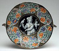 After a gap of a century, the industry revived in the late 15th century, now specializing in the technique of painted enamel, and within a few decades making rather more secular than religious pieces. In the French Renaissance it was the leading centre, with several dynastic workshops, who often signed or punchmarked their work.[2] Luxury pieces such as plates, plaques and ewers were painted with sophisticated Mannerist decoration of pictorial figure scenes, which on vessels were surrounded by elaborate borders.