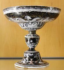 The largest three-dimensional piece to survive is a grisaille "table fountain" 490 mm tall at Waddesdon Manor in England, dated 1552, purportedly made for Diane de Poitiers, mistress of Henri II of France.[51] However, this may be a "composite" piece made up in the 18th and 19th centuries from a number of 16th century pieces, and with the joined initials of Henri and Diane added.[52]