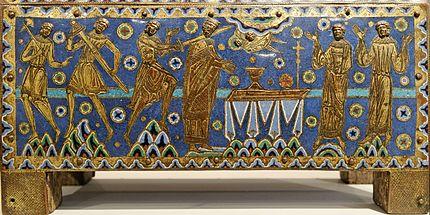 Other subjects that appear in Limoges enamel rather more often than in other religious art of the period include the life of Saint Valerie of Limoges, a local heroine, as well as the martyrdom of Saint Thomas Becket, whose cult was vigorously promoted by the church after his death, including the distribution of secondary relics (pieces of his clothes soaked in his diluted blood) around Europe. That there are more than twenty Limoges chasses showing the story of the Three Magi has slightly puzzled art historians. Their relics were "translated" from Milan to Cologne in 1164,[19] and it has been suggested that parts of the masonry from the old shrine in Milan were available as relics.[20] In subjects like these, with many surviving examples, the depictions are often closely similar, or fall into groups, suggesting shared designs, and perhaps different workshops using the same patterns.