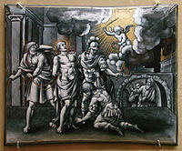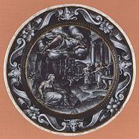 The introduction, around 1530, of the grisaille style, with most of the composition in black and white, may seem surprising in a medium which generally relied for its effect on a wide range of bright colours which could only be matched by pottery in the other media, such as metalwork, in which similar objects were made. Muted other colours, especially gold and pink for flesh, were often included. There may have been an influence from the black and white of the prints the designs were drawn from, and the style was probably much easier to fire. Grisaille areas were usually made by firing a coat of "black" enamel, in fact usually a very dark mulberry colour, sometimes a very dark blue, then adding a coat of white, and partially scratching this away before firing again. Highlights in white, gold, or other colours might then be added.[40] Grisaille pieces dominated production in the approximate period between 1530 and 1560, and thereafter continued to be made alongside polychrome ones.[41] It has been claimed that these pieces were "dark and sombre, reflecting the pessimism prevalent during the Reformation".[3]