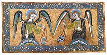 Limoges was already the largest and most famous, but not the most high quality, European centre of champlevé vitreous enamel production by the 12th century; its works were known as Opus de Limogia or Labor Limogiae.[5] The town's main competitors in the price-conscious market were northern Spanish workshops, and Limoges work shows signs of Spanish and Islamic influence from very early on; it has been speculated that there was movement of workers between the two regions.[6] The later vermiculated style and pseudo-Kufic borders are two examples of such influence.[7] Some of the early Limoges enamel pieces display a band in pseudo-Kufic script, which "was a recurrent ornamental feature in Limoges and had long been adopted in Aquitaine".[8]