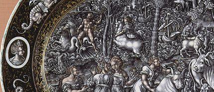 In both periods the largest pieces include narrative scenes. These exemplify the styles of their respective periods. In the medieval champlevé the action is simply and directly shown by a few figures, with patterned backgrounds. In the Mannerist painted pieces numerous figures and detailed backgrounds tend to overwhelm the activity of the main figures.