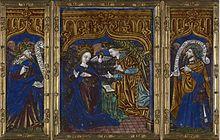 The painted enamel technique appeared during the mid-15th century, perhaps first in the Netherlands, soon followed by Limoges during the reign of Louis XI (1461–1483).[26] The first significant master, who goes by the name Monvaerni, or Pseudo-Monvaerni as the name is now known to be based on the misreading of an inscription, worked in the last decades of the century.[27] He was followed by the unknown artists called the "Master of the Louis XII Triptych", after a piece in Victoria and Albert Museum, and the "Master of the Orléans Triptych", who created a number of religious pieces before about 1515 in a style still based on the painting of the previous century.[28] These were too small for churches and evidently used for private devotions, perhaps especially for frequent travellers.[29]