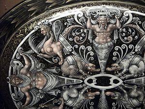 The compositions were mostly taken from German, French or Italian prints, especially for the larger scenes with many figures. Borders on the larger pieces are highly elaborate and use the full range of Mannerist ornament, diffused by ornament prints and other models. There is much strapwork and fantastic grotesques are often given a comic treatment.[37] The jolly grotesques illustrated at right are on the reverse of a large dish whose main face shows a brightly-coloured depiction of the Destruction of Pharaoh's army in the Red Sea.[38] Both designs are closely paralleled, without being exactly copied, in pieces in other collections, notably one in the Metropolitan Museum of Art in New York. The designs are also based on prints, but adapted by the enamellers for their pieces.[39]