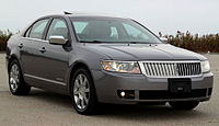 The 2007 MKZ was first shown at the Chicago Auto Show in February 2006. In addition to its new name, the MKZ gained a number of changes over its predecessor. The standard and optional versions of the MKZ's 17 x 7.5-inch wheels were restyled. An intelligent all-wheel-drive system was now available, seamlessly distributing power to each wheel for optimum traction. Powering the MKZ, and taking a large step toward further differentiating the car from the Fusion and Milan, was Ford's new, all-aluminum 3.5-L DOHC Duratec 35 V6. The engine was tuned to produce 265 hp (196 kW) at 6250 rpm and 249 lb·ft (337 N·m) of torque at 4500 rpm. Significantly, the new engine needed only 87-octane regular-grade gasoline to achieve its output.[11] Also, in spite of the MKZ's power advantage over the 3.0-L DOHC V6-equipped Zephyr, the fuel economy of the MKZ rivals that of the Zephyr at 17 mpg‑US (14 L/100 km; 20 mpg‑imp) in city driving and 25 mpg‑US (9.4 L/100 km; 30 mpg‑imp) on the highway in front-wheel-drive models.[12] A road test by Motor Trend found that an MKZ equipped with all-wheel-drive could accelerate from zero to 60 mph (97 km/h) in 6.8 seconds and complete a quarter mile in 15.2 seconds at 93.4 mph (150.3 km/h) due to the more powerful engine and extra traction.[13] One of the few other changes applied to the 2007 MKZ was a revision to the available THX II-certified audio system to increase speakers to 14 and its peak output to 600 watts. Beyond the MKZ's changes, the car remained positioned as an entry-level luxury sedan with base models still starting at just under US$30,000 and fully optioned models remaining below $40,000.