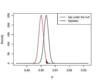 We would have been equally surprised if we had seen 49,581 female births, i.e. , so a frequentist would usually perform a two-sided test, for which the p-value would be . In both cases, the p-value is lower than the significance level, α, of 5%, so the frequentist approach rejects as it disagrees with the observed data.