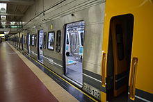 The remaining Nagoya cars were moved to Line C in 2007 and replaced with the 100 Series cars and with Fiat-Materfer cars. To make the rolling stock more uniform, 24 more modern 300 Series Alstom Metropolis cars were ordered in 2013 to replace the Materfer cars on the line, meaning that the line would be entirely composed of 120 Alstom cars.[8] In September 2015, at a conference in Brazil, the head of SBASE gave a presentation in which the number of new cars to be purchased for the line was 84 instead of 30.[9] By 2016, the final figure had been fixed at 60 new cars, meaning that the fleet will be composed of 156 Alstom Metropolis cars by 2017.[10]