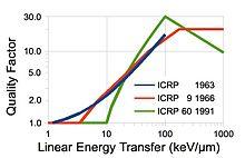 The International Commission on Radiation Protection (ICRP) proposed a simplified model of RBE-LET relationships for use in dosimetry. They defined a quality factor of radiation as a function of dose-averaged unrestricted LET in water, and intended it as a highly uncertain, but generally conservative, approximation of RBE. Different iterations of their model are shown in the graph to the right. The 1966 model was integrated into their 1977 recommendations for radiation protection in ICRP 26. This model was largely replaced in the 1991 recommendations of ICRP 60 by radiation weighting factors that were tied to the particle type and independent of LET. ICRP 60 revised the quality factor function and reserved it for use with unusual radiation types that did not have radiation weighting factors assigned to them.[8]