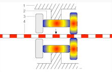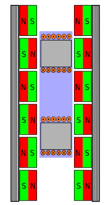 Free-body diagram of a U-channel synchronous linear motor. The view is perpendicular to the channel axis. The two coils at centre are mechanically connected, and are energized in "quadrature" (meaning a phase difference of 90° (π/2 radians) between the flux of the magnets and the flux of the coils). The bottom and upper coils in this particular case have a phase difference of 90°, making this a two phase motor. (Not to scale)