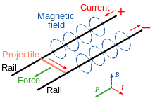 In this design a large current is passed through a metal sabot across sliding contacts that are fed from two rails. The magnetic field this generates causes the metal to be projected along the rails.