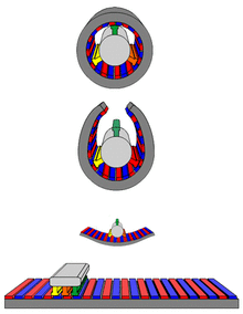 In this design, the force is produced by a moving linear magnetic field acting on conductors in the field. Any conductor, be it a loop, a coil or simply a piece of plate metal, that is placed in this field will have eddy currents induced in it thus creating an opposing magnetic field, in accordance with Lenz's law.[6] The two opposing fields will repel each other, thus creating motion as the magnetic field sweeps through the metal.