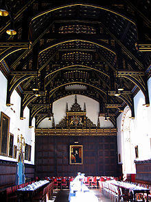 Linenfold (or linen fold) is a simple style of relief carving used to decorate wood panelling with a design "imitating window tracery",[1] "imitating folded linen"[2] or "stiffly imitating folded material".[3] Originally from Flanders, the style became widespread across Northern Europe in the 14th to 16th centuries. The name was applied to the decorative style by antiquarian connoisseurs in the early 19th century; the contemporary name was apparently lignum undulatum (Latin: "wavy wood"), Nathaniel Lloyd pointed out.[4]