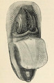 The stalk (or pedicle) is a long white extension of the body, that emerges at the apex from between the valves, and not, as in articulate brachiopods, from a special opening in the dorsal valve. At the rear end, that is deepest in the sea bed, the skin (or epithelium) secretes a glue-like mucus that binds to the substrate's particles, thus temporarily anchoring the animal. The very thick skin (cuticle) is not composed of cells, and is opaque, being secreted by a very thin white epidermis, which is attached by a very thin layer of connective tissue to the white muscle inside. The muscle fibres are attached to the connective tissue and are wound like helixes. In the centre of the muscle runs an inconspicuous tube-shaped opening along the entire length, which is an extension of, and in open connection with, the body cavity within the shell. It is lined by a layer of one cell thick mesothelium.[2]