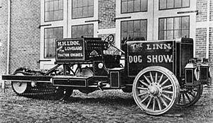 Linn was a native of Maine and in his quest for a better machine to travel rural roads with his dog and pony show equipment gave up on a six-wheel-drive design by 1907 to have Alvin Lombard, of Waterville, build a machine using the tracks off a Lombard Steam Log Hauler, and underslung gasoline engine and wheels on front. It was equipped with a ship-style cabin with living quarters and able to pull a string of wagons behind as well as supply electric lights for his circus. By 1909 this was replaced because of size with a single rear-tracked machine with standard wheeled front axle; however as Linn had become employed as a salesman, demonstrator and mechanic for Lombard a patent dispute erupted and Linn left Maine with his show.