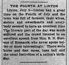 - ^ "THE CITY - The Fourth at Linton". The Bismarck Tribune: 5. July 7, 1907.