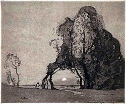 Lindsay was good friends with Ernest Moffitt and published a book on his art, A Consideration of the Art of Ernest Moffitt (1899). In 1907 he held an extremely successful exhibition of etchings in Sydney with the Society of Artists. The two decades after 1907 saw him active with the Society of Artists and in 1921, when the Australian Painter-Etchers' Society was formed, Lindsay was its first president. He began to exhibit in London in 1923 and had his most successful exhibition of that period at Colnaghi, a London art dealer, in 1927. Colnaghi's Galleries and the critic Harold Wright led British interest in Lindsay's work and guaranteed his reputation as a major British printmaker and watercolourist.