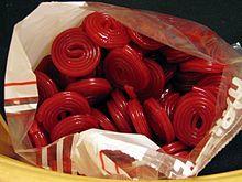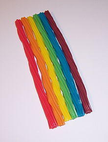 Liquorice (British English) or licorice (American English) (/ˈlɪkərɪʃ, -ɪs/ LIK-ər-is(h))[1] is a confection usually flavoured and coloured black with the extract of the roots of the liquorice plant Glycyrrhiza glabra. A wide variety of liquorice sweets are produced around the world. In North America, black liquorice is distinguished from similar confectionery varieties that are not flavoured and coloured black with liquorice extract but commonly manufactured in the form of chewy ropes or tubes. So called "black liquorice" together with anise extract is also a widespread flavour in other forms of confectionery such as jellybeans. In addition to these, various other liquorice-based sweets are sold in the United Kingdom, such as liquorice allsorts. Dutch and Nordic liquorice characteristically contains ammonium chloride instead of sodium chloride, prominently so in salty liquorice.