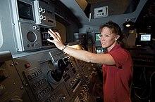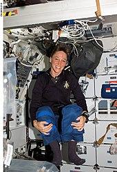 While Discovery was docked with the ISS, the STS-121 crew conducted three spacewalks. The women were not considered for this activity; when NASA trimmed the space suit budget in the 1990s, small sizes were omitted. Women astronauts were assigned to other tasks like operating the robotic arms.[58] From the Destiny laboratory on the International Space Station, Nowak operated the robotic arm whose installation she had overseen as CAPCOM years before. It was more challenging to operate than the one of the Space Shuttle, since it was larger and had an additional joint.[59]