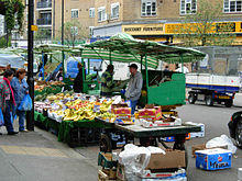 Church Street runs parallel to St John's Wood Road and plays host to a varied market Mondays–Saturdays, 8am–6pm selling fruit and vegetables, clothes, and bags amongst other items.[21] Towards the Lisson Grove end of Church Street is Alfie's Antique Market,[22] London's largest indoor market for antiques, collectables, vintage, and 20th century design is in the former Jordans Department Store, decorated with an Egyptian art deco theme similar to the Aeroworks – the indoor market, "houses more than 200 permanent stall holders and covers in excess of 35,000 sq ft of shop space on five floors."[23] Opened in 1976 by Bennie Gray, in the then derelict department store, the Antiques Market has since spawned twenty or so individual shops at the Lisson Grove end of Church Street specialising in mainly 20th-century art and collectables