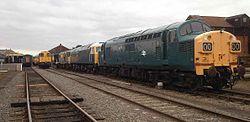 A range of diesel locomotives (Classes 37, 47, 31, 20 and 56) at Dereham