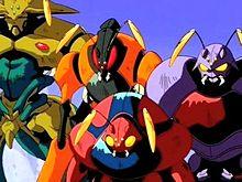 The Bugrom tribe is a race of largely human-sized or above human-sized insectoid creatures. Though their origin is unclear, it is likely they represent part of the indigenous fauna of El Hazard, being a dominant species prior to human colonization in the far past. They exist in several different varieties and are much stronger than an average human. Only Fujisawa is capable of defeating them in hand-to-hand combat with his super strength. Although typically rather unintelligent and disorganized, Jinnai rallies them into an effective army, and with the help of Ifurita, they come extremely close to conquering El-Hazard before they are almost completely wiped out when Princesses Rune Venus and Fatora activate the Eye of God. In the rest of the OVA continuity (EL Hazard: The Magnificent World 2 and El Hazard: The Alternative World), they are thus focused on creating a new hive in order to repopulate and eventually launch a retaliatory attack. In The Wanderers, Jinnai and the Bugrom forces are the primary antagonists rather than the Phantom Tribe.