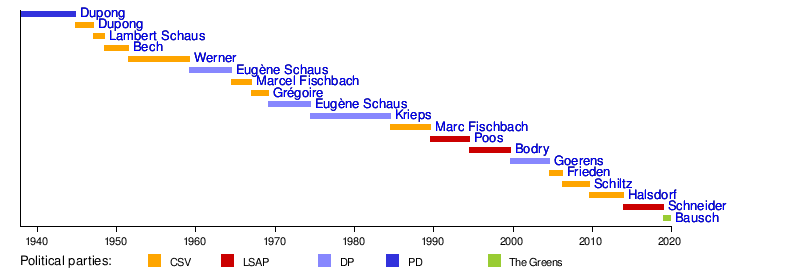 | Etienne Schneider | LSAP | 4 December 2013 | 5 December 2018 | Xavier Bettel | |