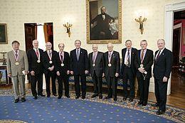 President George W. Bush (5th from left) and Dr. John Marburger (far right), director of the White House Office of Science and Technology, pose with the recipients of National Medal of Science, Monday, Feb. 13, 2004, in the White House. From left to right are Dr. Dennis P. Sullivan, Dr. Phillip A. Sharp, Dr. Robert N. Clayton, Dr. Stephen J. Lippard, Dr. Kenneth J. Arrow, Dr. Norman E. Borlaug, Dr. Edwin N. Lightfoot and Dr. Thomas E. Starzl.