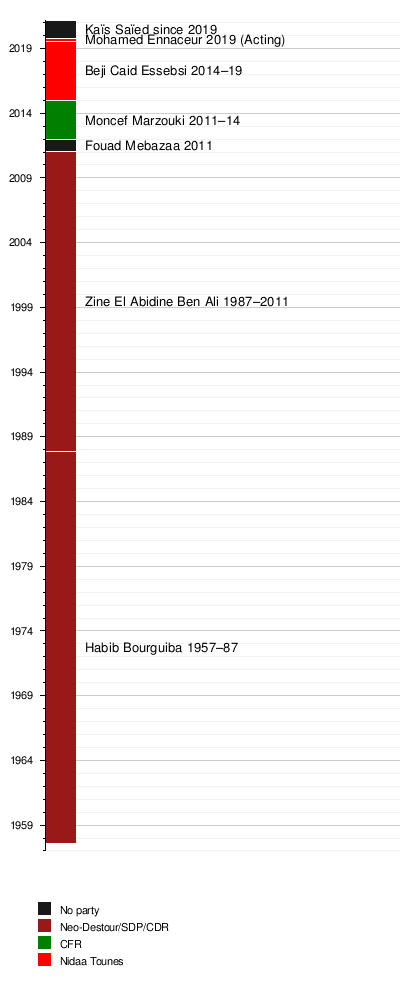 | 7[i] | Kais Saied Born: 22 February 1958 President of the Republic | 23 October 2019 – Incumbent | Non-partisan | 1 (2019) | 23 October 2019 – present (Term expires on 23 October 2024) | |||||
