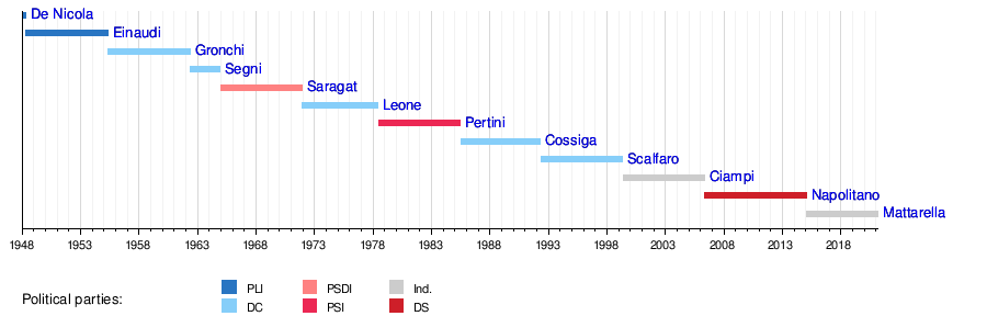 | 12 | Sergio Mattarella (born 1941) | 3 February 2015 | Incumbent | 6 years, 11 days | Independent[g] | 2015 | Renzi Gentiloni Conte Draghi | ||