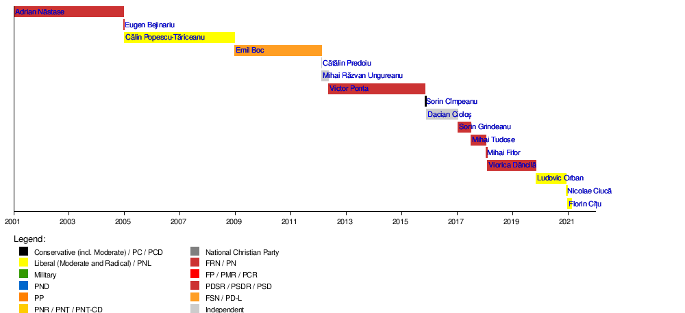 | 59 | Adrian Năstase (born 1950) | 2000 | 28 December 2000 | 21 December 2004 | 3 years, 359 days | PSD | Năstase | |