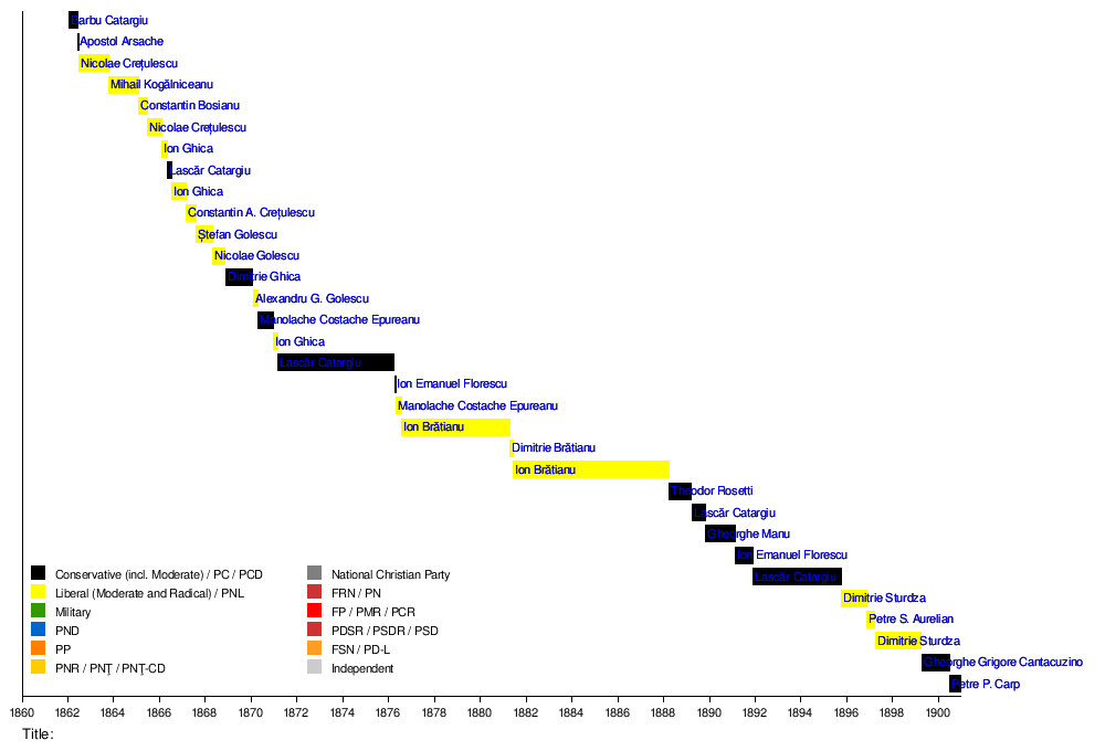 | 14 | Ion Brătianu (1821–1891) | — | 5 August 1876 | 13 March 1881 | 4 years, 220 days | PNL | I. Brătianu I–II–III | |