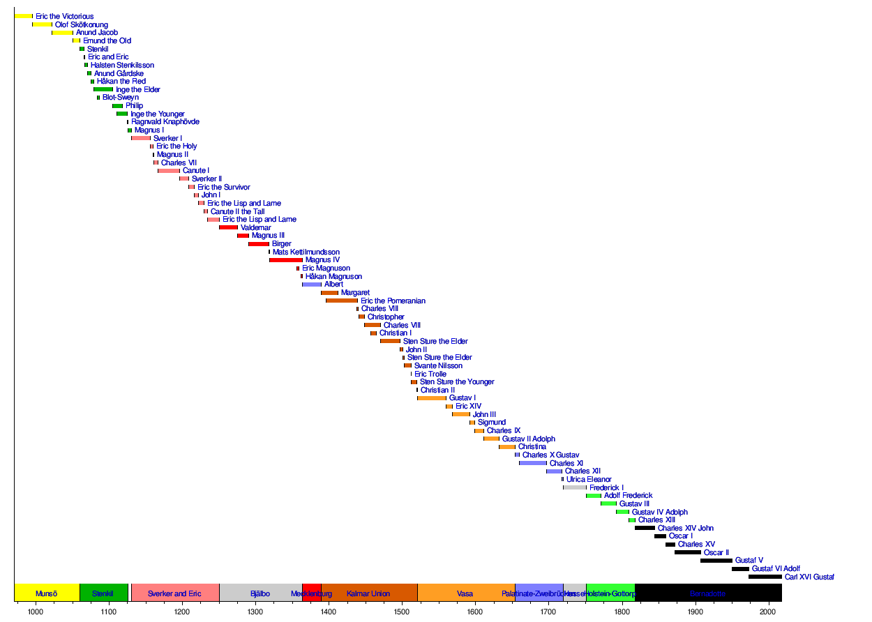 Sverker II the Younger (Sverker den yngre), 1196 – 31 January 1208 | ![]() | born before 1167, probably already c. 1164 son of king Charles VII and queen Christine Stigsdatter of Hvide | (1) Benedicta House of Hvide | Died in the Battle of Gestilren, 17 July 1210, aged about 45, buried at Alvastra Abbey |