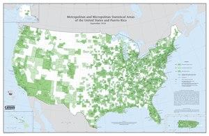 An enlargeable map of the 938 core-based statistical areas (CBSAs) of the United States and Puerto Rico. The 392 MSAs are shown in medium green . The 546 micropolitan statistical areas (μSAs) are shown in light green .
