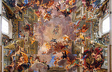 Trompe-l'œil ceiling fresco by Andrea Pozzo. The ceiling is completely flat, including the dome on the left/