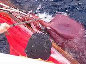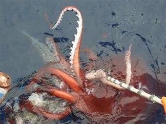 | 17 () | 25 June 2005 | "South Georgia waters" at 1625 m depth | Caught alive by long-lining fishing vessel; "caught on a number of hooks on a longline" set to target Patagonian toothfish | Mesonychoteuthis hamiltoni | Entire; alive | Head with tentacles and arms; mantle too heavy to bring aboard | WL: ~5 m [estimate]; WT: 150–200 kg [estimate] | [Anonymous] (2005); O'Shea (2005) | Caught by longliner Isla Santa Clara. Five men, including the ship's scientific observer, attempted to bring the squid aboard. Paul McCarthy, the scientific observer, estimated the length and weight of the squid. Specimen was sent to King Edward Point (KEP) Scientists for formal identification. Filmed at the surface by Ramon Ferreira Gomez; possibly first colossal squid to be filmed alive. | |||