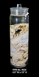 A number of fragmentary giant squid remains were displayed as part of "In Search of Giant Squid", a Smithsonian travelling exhibition curated by Clyde Roper that visited a dozen US museums and other educational institutions between September 2004 and August 2009 ([NMNH], 2004; [SITES], 2004). The exhibition opened its national tour at Yale University's Peabody Museum of Natural History, which has maintained a strong association with the giant squid from the time of the Newfoundland strandings in the 1870s. Preparations for the Peabody exhibition, overseen by site curator Eric Lazo-Wasem, uncovered giant squid material in the museum's collections that was not previously known to be extant, including original specimens from Addison Emery Verrill's time ([Anonymous], 2004b; Miller, 2004).