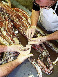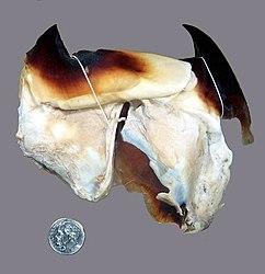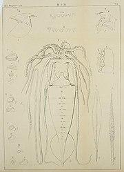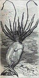 13. ^ The length of the "body [..] from the beak to the extremity of the tail" (i.e. mantle plus head) was said to be 20 ft (6.1 m), with "one of the arms" (presumably a tentacle) measuring 35 ft (10.7 m), for a total length of 55 ft (16.8 m) (Verrill, 1880a:191; Verrill, 1880b:285). The total length of the "Thimble Tickle specimen" is sometimes mistakenly cited as 57 ft (17.4 m) according to Paxton (2016a:83). Over time, various other superlative measurements have been attributed to the specimen, including a mass of 2 tonnes and an eye diameter of 40 cm (Ganeri, 1990:24). Wildly excessive mass estimates for the specimen have included (see Wood, 1982:190; Ellis, 1998a:107): 29.25 or 30 short tons (26.5 or 27.2 tonnes) (MacGinitie & MacGinitie, 1949); near 24 tonnes (Heuvelmans, 1958); 2.8 or "more realistic[ally]" 2 tonnes (Akimushkin, 1963; Wood, 1982:190); and less than 8 tonnes (MacGinitie & MacGinitie, 1968).